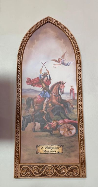 In the reign of the Roman emperors Decius & Valerianus they sent out a decree that all people of all ranks slave or freeman should offer sacrifices onto the Roman Idles, & those who disobey the decree would face a death penalty. Soon after the edict War broke out between the barbarians and the Romans, 2 armies fought fiercely against each other. One day at the peak of the battle Mercurius (Philopater was named Mercurius when he was promoted to the rank of command) had a vision, he saw a man surrounded by light holding a drawn sword in his right hand, handing him the sword, telling him that he would have victory over the barbarians, and to remember the Lord, our God after the battle.Our saint then took the sword and dashed into the midst of the barbarians and mowed the enemy down like grass, he attacked so strongly that he slayed their King, his company & many others, the barbarians were terrified they broke down and fled, the Romans were victorious. Thereafter, Mercurius was given the title "Supreme Commander Of all the Roman Armies" at 25 years of age. The hero Mercurius became preoccupied with his new life, & every city that was passed a festival was held in his honour.